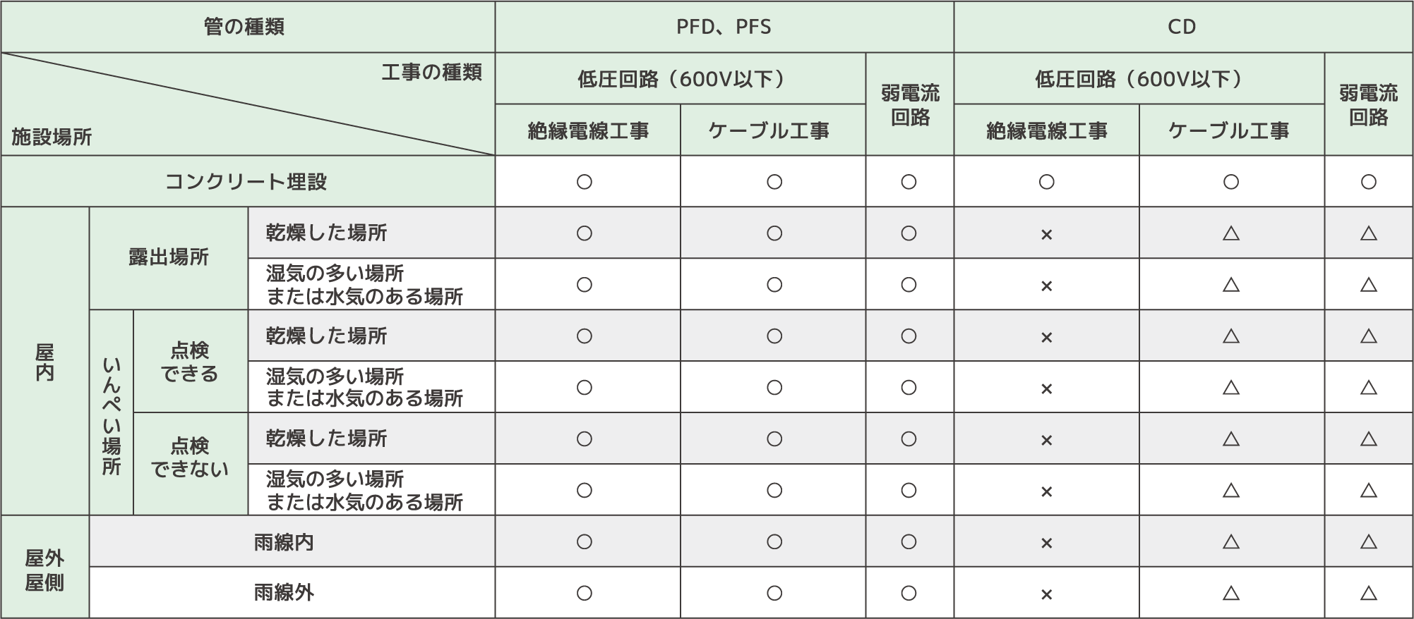 〇:施設できる ×:施設できない △:自己消火性であるPF管での施設が望ましい。