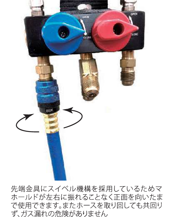 先端金具にスイベル機構を採用しているためマニホールドが左右に振れることなく正面を向いたままで使用できます